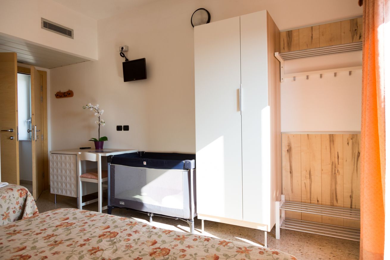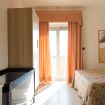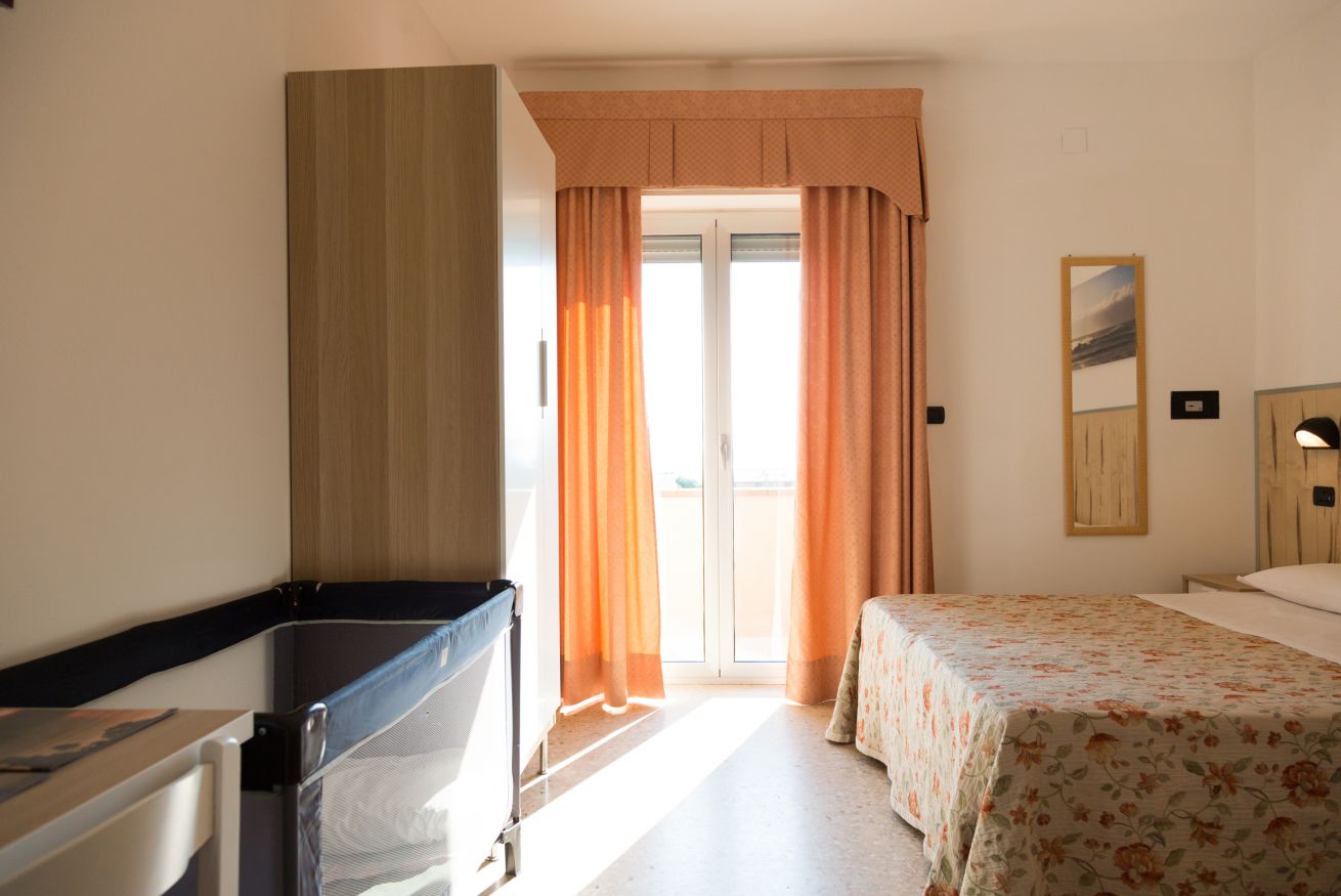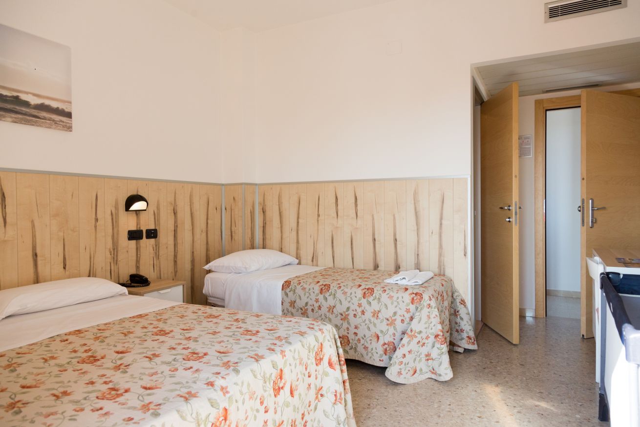 Camera quadrupla di mq 19 raggiungibile con ascensore, attrezzata con un letto matrimoniale (2 letti singoli accoppiati) e un letto a castello o letto singolo. Dispone di tv, minibar, cassaforte, wifi free, aria condizionata, balcone e servizi con box doccia. Possibilità di inserire una culla.